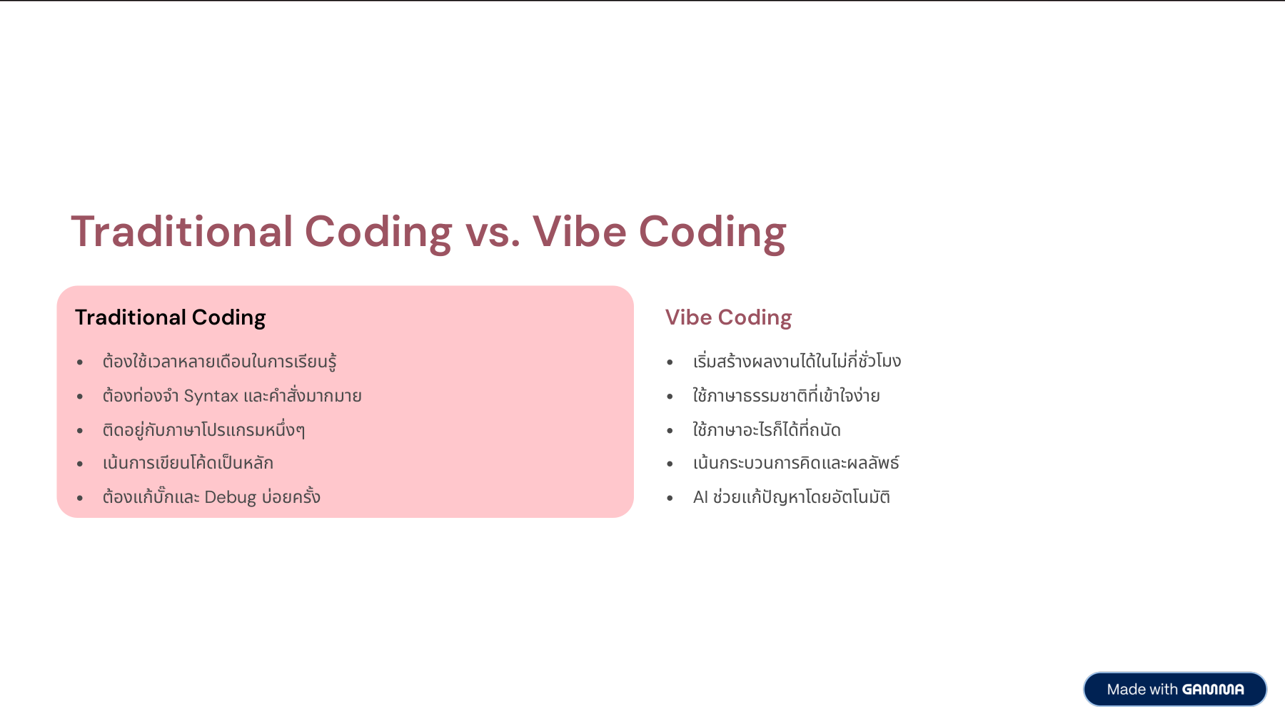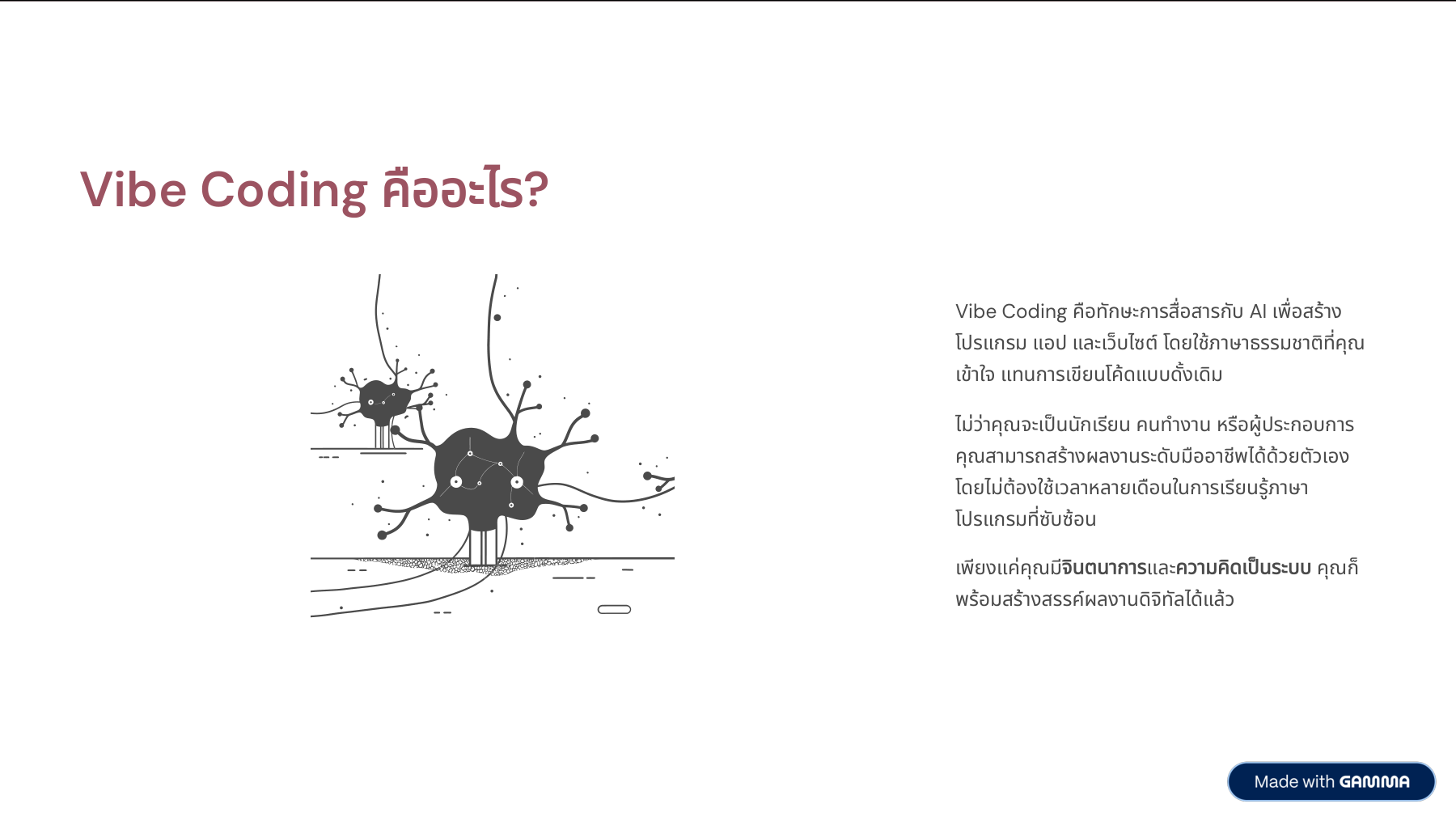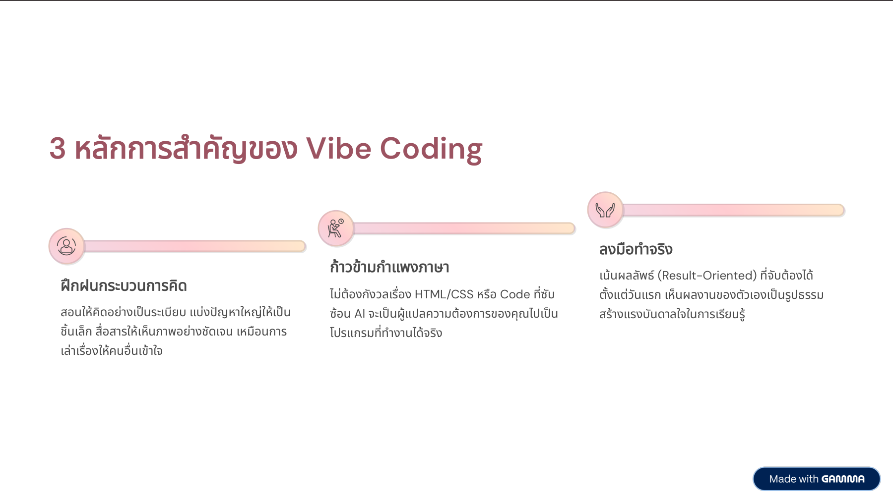 "Vibe Coding คือวิธีการที่ให้ความสำคัญกับ สัญชาตญาณมากกว่าไวยากรณ์ โดยพลิกกลับเส้นทางการเรียนรู้แบบดั้งเดิมด้วยการนำเสนอ ผลลัพธ์ (พฤติกรรมทางภาพที่โต้ตอบได้) ก่อน"