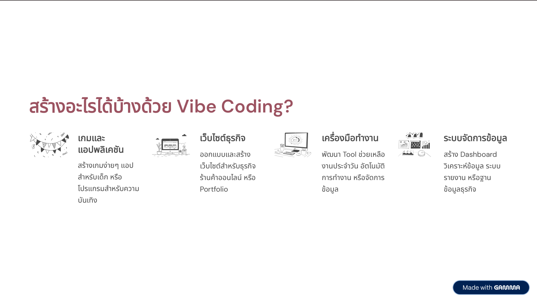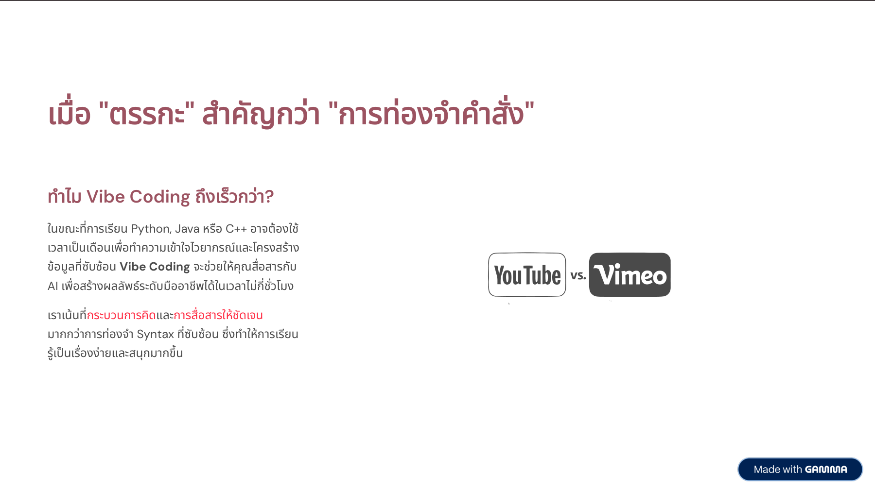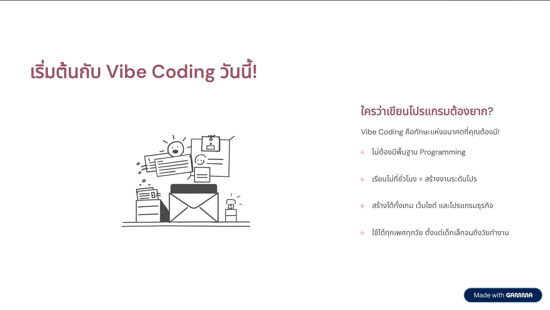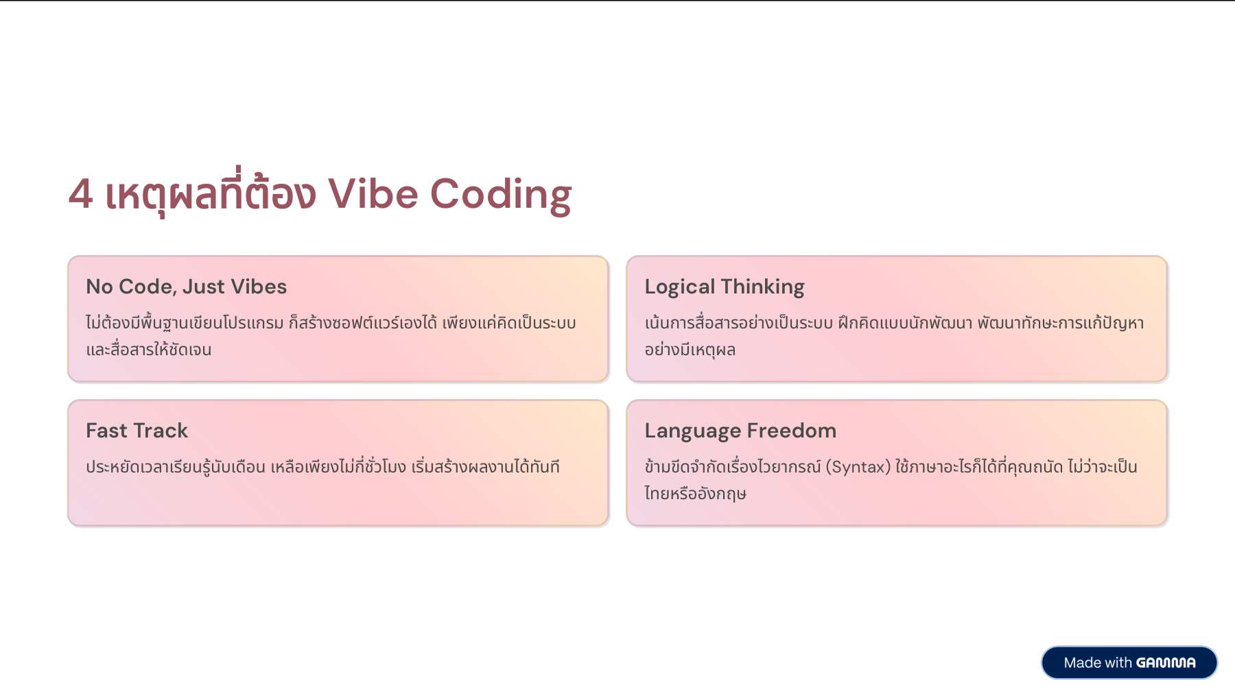 "Vibe Coding คือวิธีการที่ให้ความสำคัญกับ สัญชาตญาณมากกว่าไวยากรณ์ โดยพลิกกลับเส้นทางการเรียนรู้แบบดั้งเดิมด้วยการนำเสนอ ผลลัพธ์ (พฤติกรรมทางภาพที่โต้ตอบได้) ก่อน"